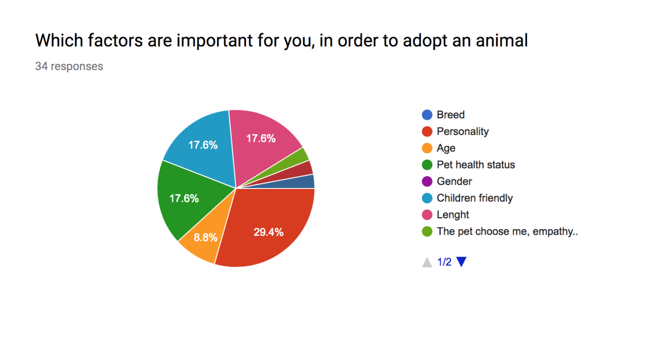 I started to build an online survey in order to find out people preoccupations when adopting a dog. 34 Portuguese people answered to the survey. 61,8% were female and 38,2% were male. 50% of the people have already adopted a pet. 29,4% of the people answered that the most important factor to choose an animal is Personality.