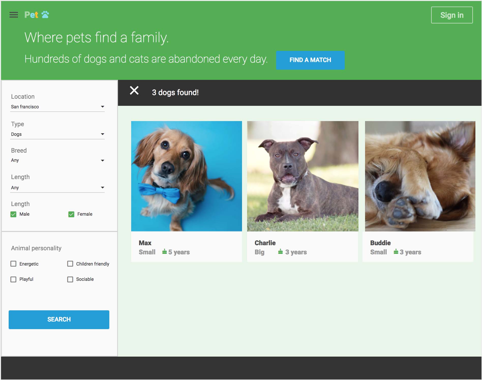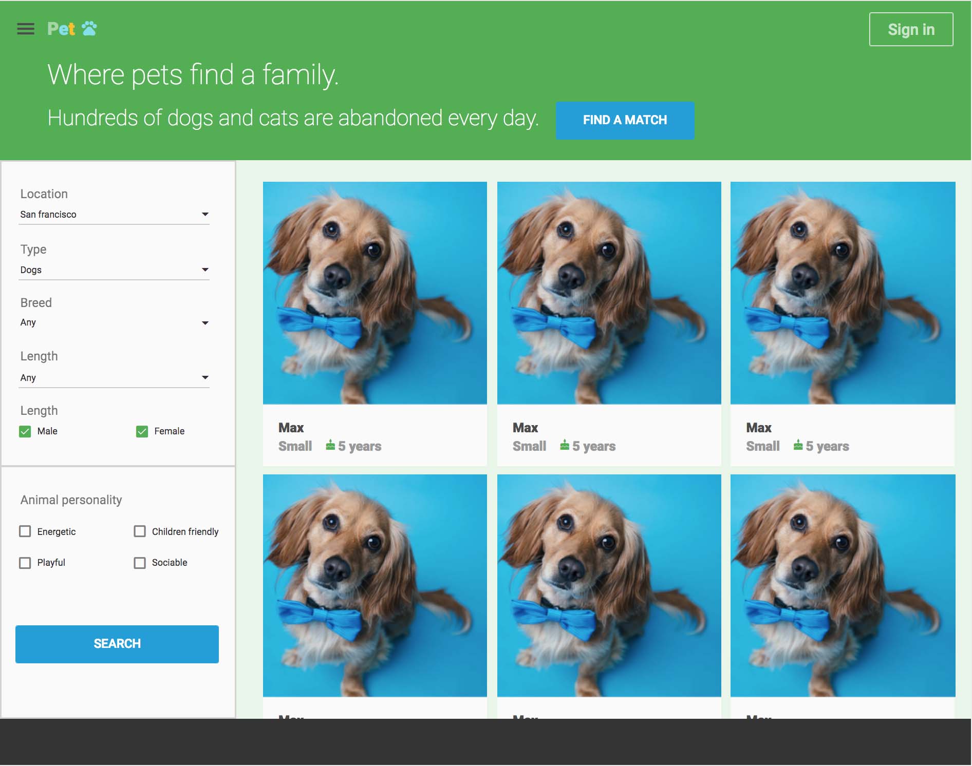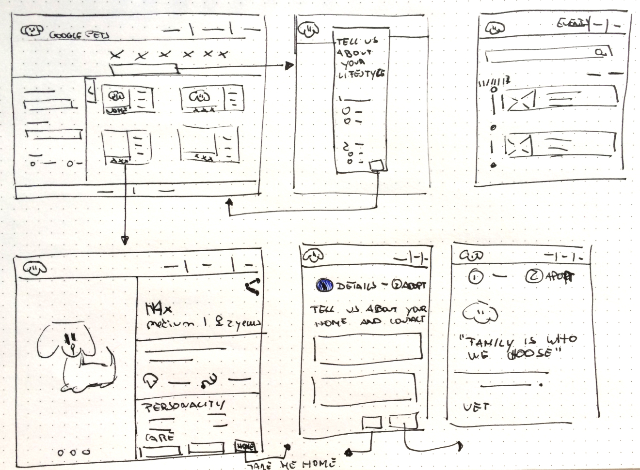 As part of a Google design exercise I took a challenge to design an experience to help connect people looking for a new pet and find the right companion for them. I started this exercise with ux research, then moved on to low-fidelity prototyping and then to high-fidelity interactive mockup. Time spent on this exercise: ~11h