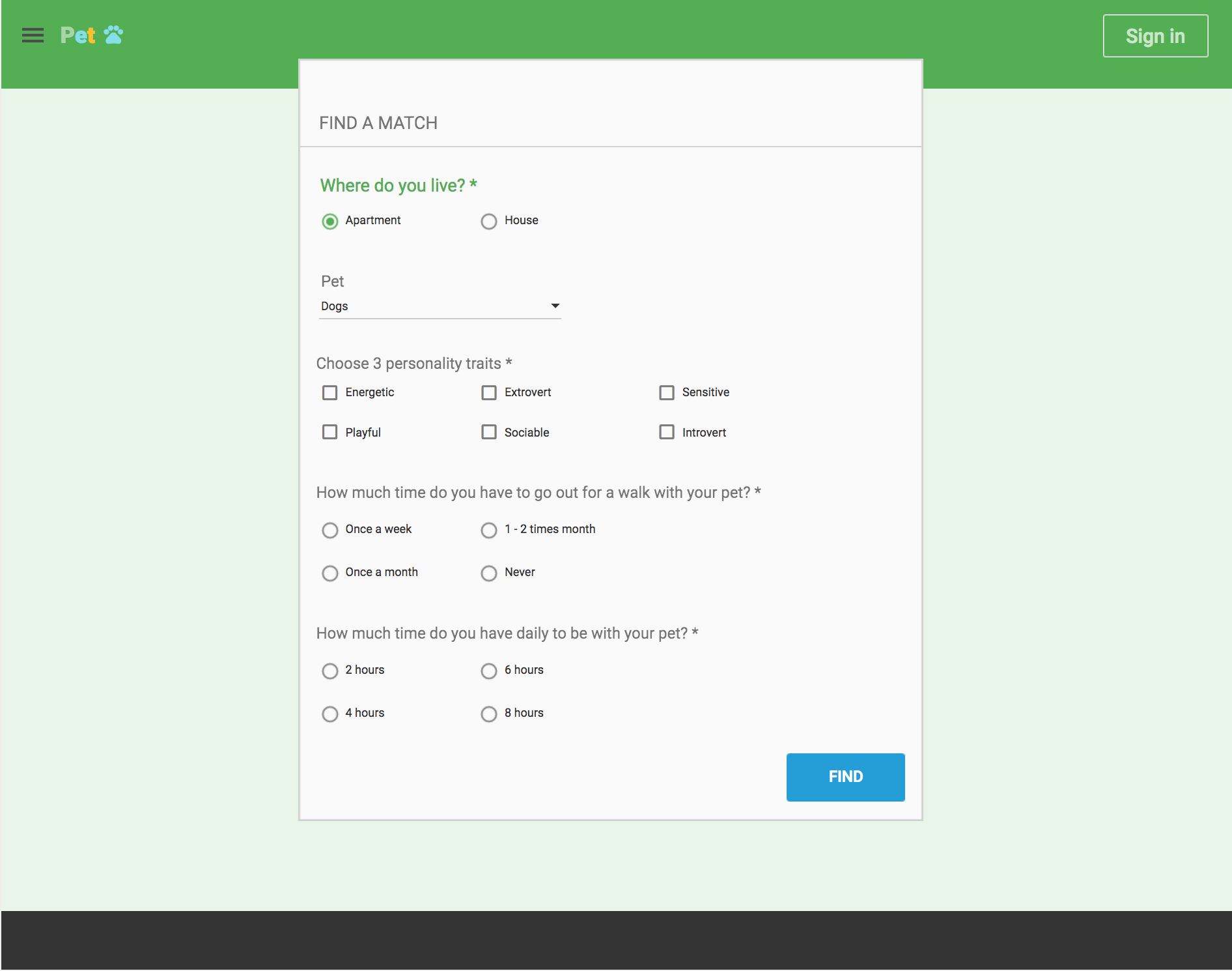 Clicking on “Find a match” the person goes to a form. Since is a people’s preoccupation having enough space and time, this can be a away to filter pets which need more or less space or attention.