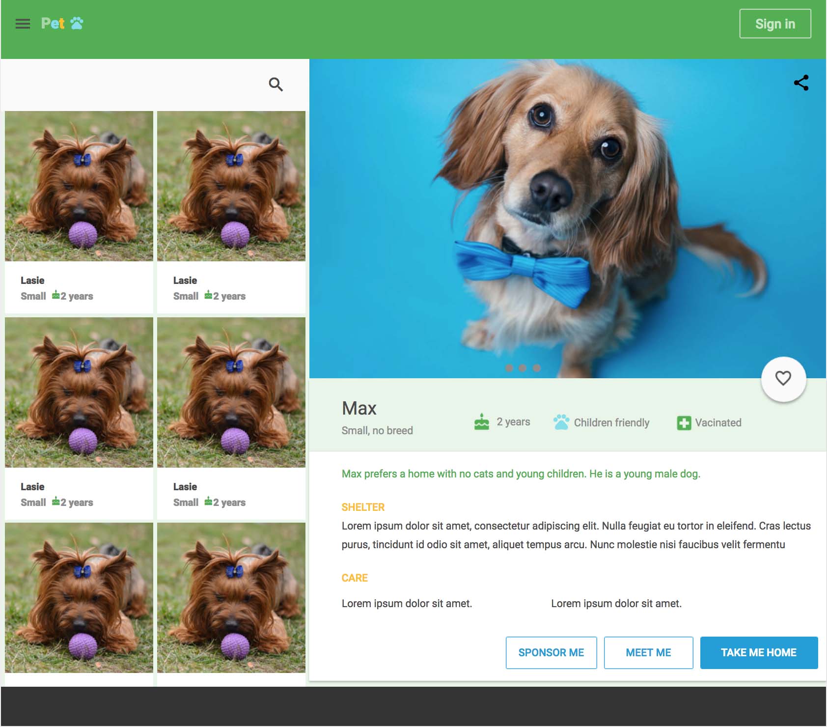 At this page there are two sections. One with other dogs and the person can search a specific dog. The other section has the photo section, where the person can navigate to see more photos. On top of the photo there is share button so that the person can share the photo with other people.There is also the possibility to bookmark the pet by clicking on the heard.Then there is a section with highlights, and here would be interesting have the top advantage of this dog, in this case is “children friendly”.The section below shows more detailed information like preferences, in which shelter is, how to take care of him. At the bottom the person can sponsor max, meet max or take him home. Clicking on taking him home the person would go through a stepper and the shelter could contact the person after.