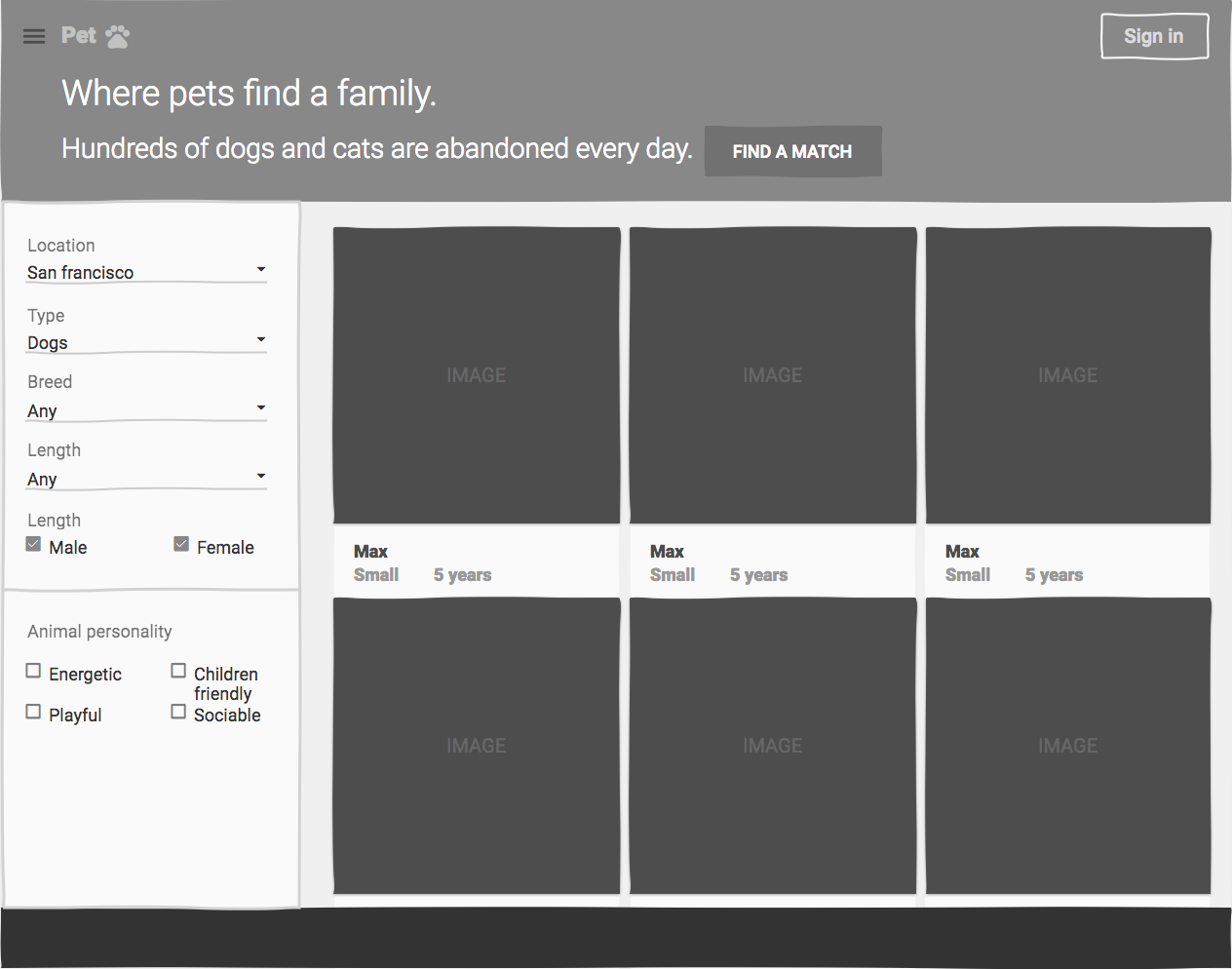 The structure of this page is composed by header, content and footer. The header has the logo, allows a person to find a match, and login in. The idea of finding a match is to help people find a pet by empathy. Usually there is empathy when there are similar behaviours. So, clicking on “Find a match” the person will fill a form and then see pets accordingly.